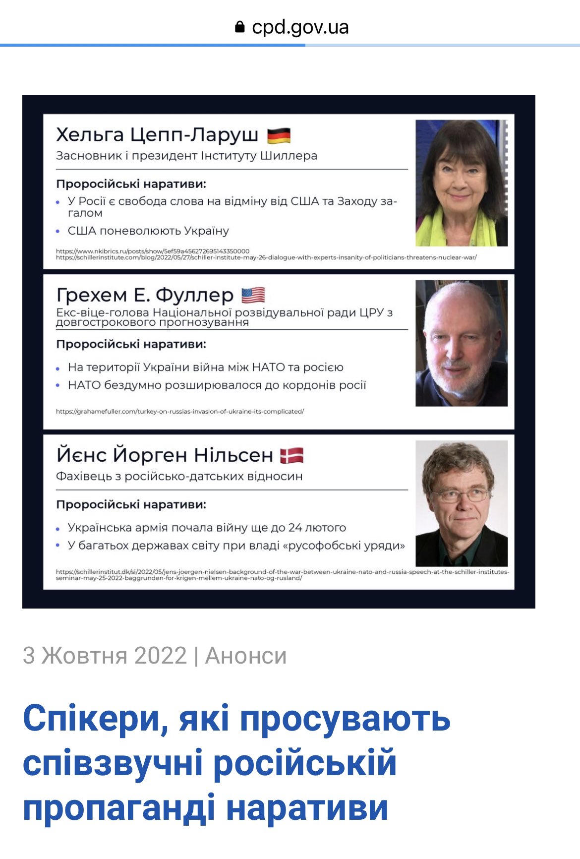The notorious Center for Countering Disinformation (CCD), operating under Ukrainian President Volodymyr Zelenskyy’s National Security and Defense Council, today posted on its website an expanded version of its hitlist against “Speakers Who Promote Narratives Consonant with Russian Propaganda.” The CCD first published a hitlist on July 14, 2022, as the first shot in its campaign to get anyone deviating from the NATO narrative about the Ukraine-Russia conflict declared an “information terrorist” and tried as a “war criminal”—or to be killed by Nazi hit squads. At least five of those fingered in the CCD’s first list were also found to be included in the fascist “Myrotvorets” list of enemies to be “liquidated,” two of them (Schiller Institute founder Helga Zepp-LaRouche and Schiller Institute spokesman Harley Schlanger) explicitly on the basis of their having been singled out on the CCD hitlist.